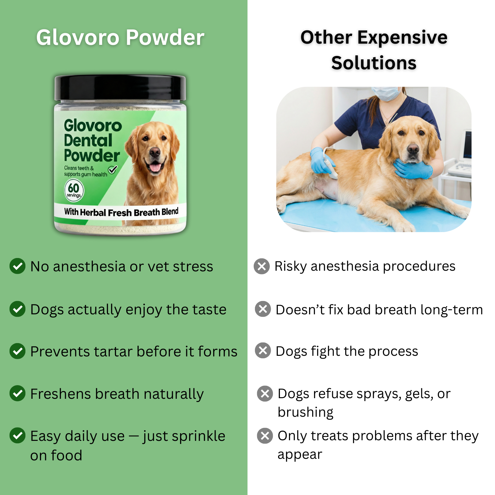 We offer a 90-day money-back guarantee. If you don't see improvement in breath, gum health, or eating behavior after consistent use, contact us for a full refund. We stand behind Glovoro because we've seen it work for thousands of dogs.